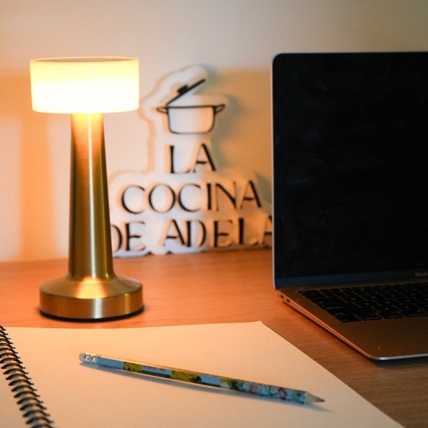 Lampara de metal con pantalla redonda lisa color cobre con usb y luz led. Tactil en pantalla con 3 niveles de luces