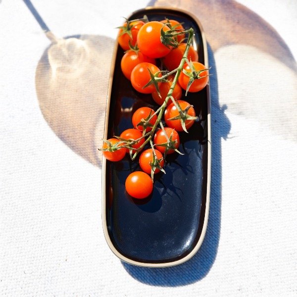 Bandeja alargada de ceramica negro brillante. Tiene una terminación con borde y base gres color beige. Ideal para sushi.