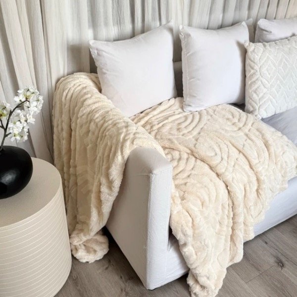 Manta con pelo largo, con estampas en forma de arcos 100% poliester natural. Super calentita