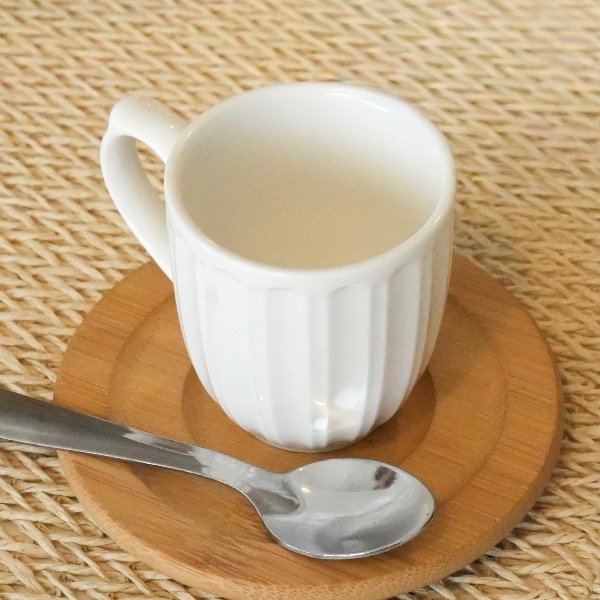 Set x 6 tazas de porcelana blanca rayadas con plato de bamboo