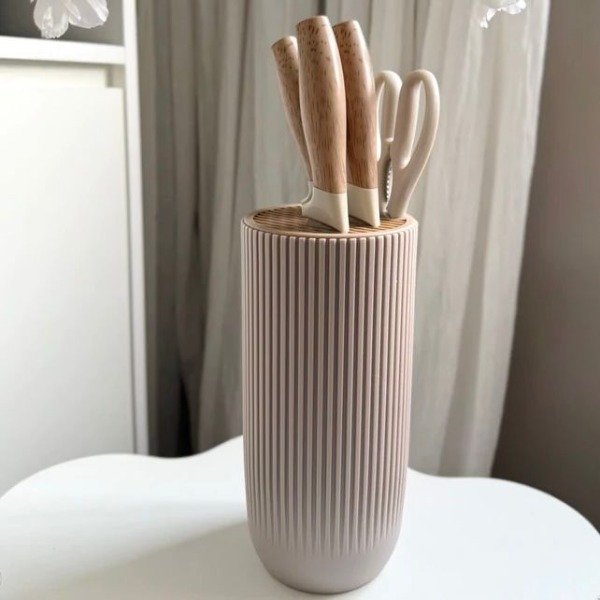 Set x 6 piezas, 4 cuchillos, 1 tijera y un organizador color crema