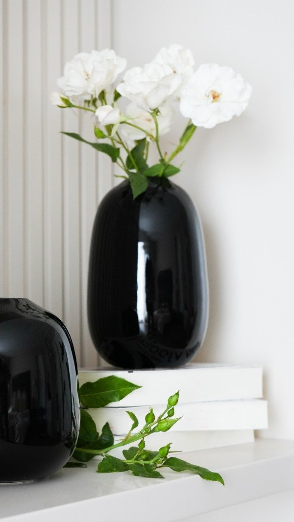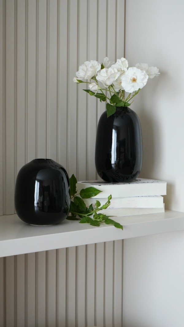 Jarron negro de ceramica y forma globular. Boca angosta ideal para ramos secos o frescos