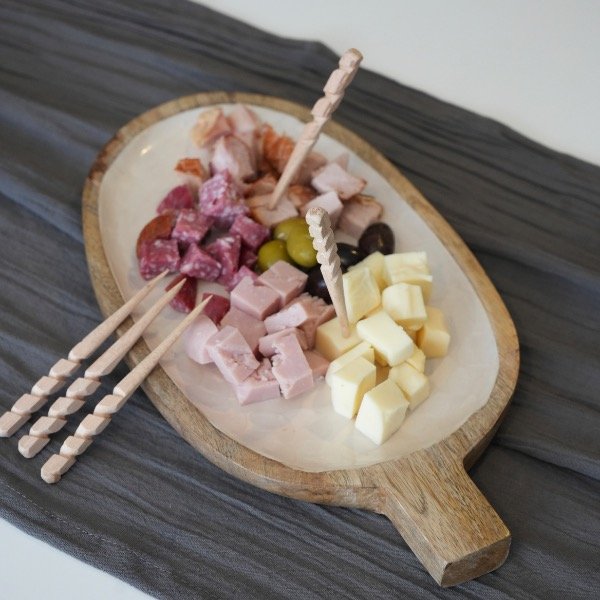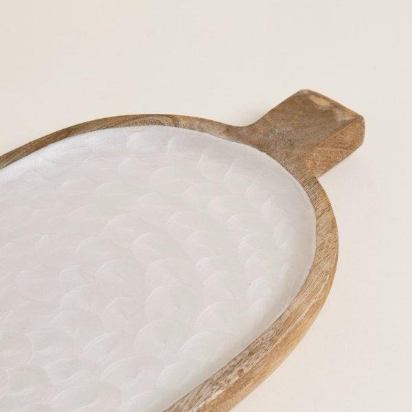 Fuente oval con mango de madera y enamel, material vitreo y brilloso